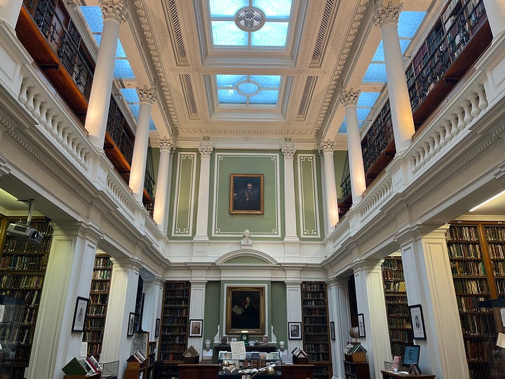 You might be wondering how I ended up here. In the winter of 2021, when gas prices suddenly skyrocketed and the current cost of living crisis kicked off, the Linnean society put out a tweet. It invited members of the public to come and spend time in the library - a warm, cosy (and free) place in central London. I took them up on it. Featuring skylights, pillar, portraits and of course the smell of old books, the library never fails to transport me back to student days.